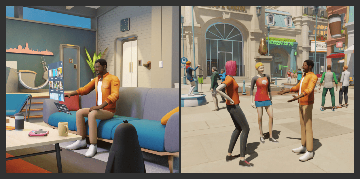 The private spaces include not only your home but also classrooms and meeting rooms for those water cooler conversations or hour-long meetings that used to take place in person in real offices. The public Manova realm has a central city center hub to play games or watch big entertainment events.