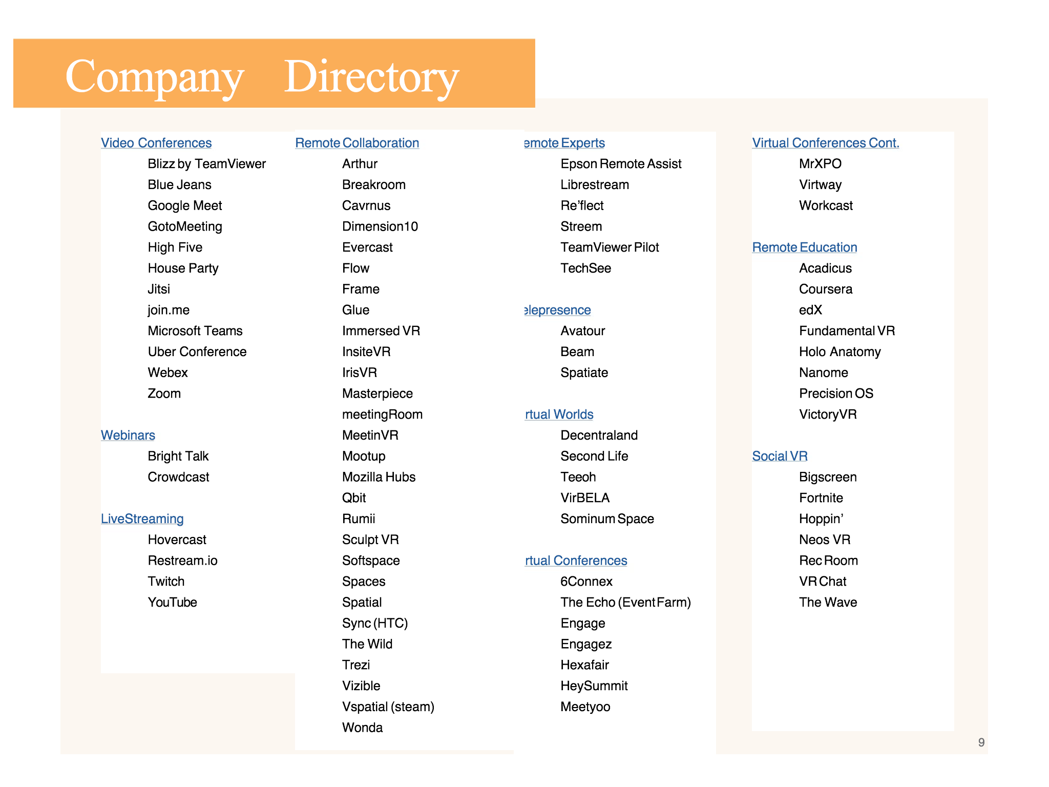 Beam is lumped in with Avatour (which should have been categorized together with Hoppin’, since it’s another 360-degree video platform); and Spatiate (an augmented reality workplace collaboration app that should have been placed in that section). What the hell?